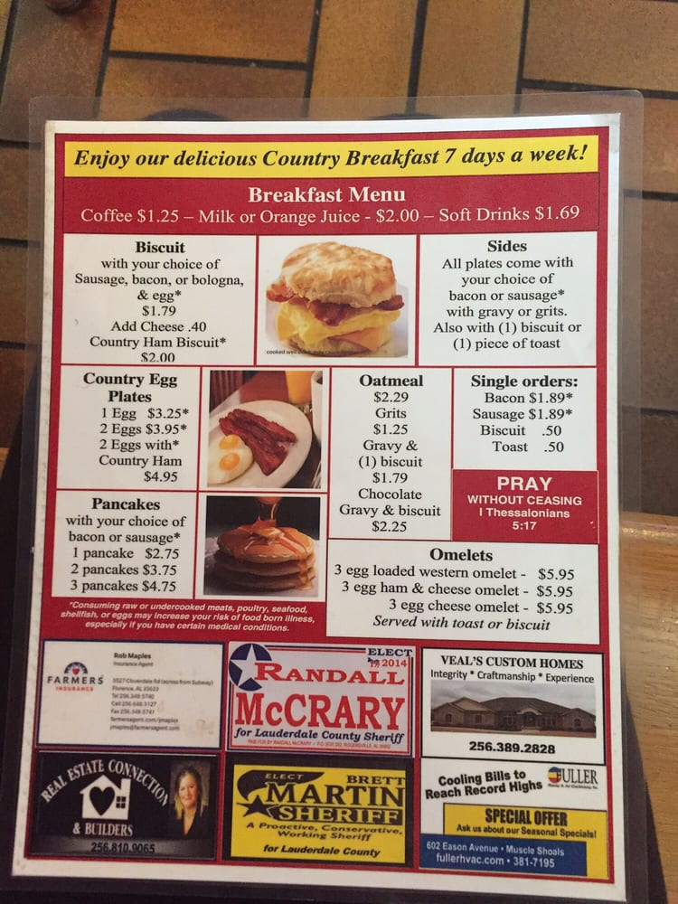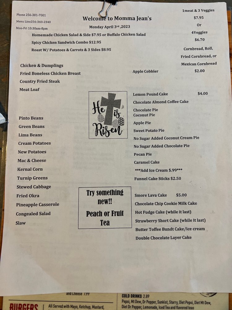 Mama Jean's Restaurant in Florence, AL offers a cozy American dining experience with a diverse menu. From savory appetizers like Veggie Quesadilla and Fried Mushrooms to satisfying salads like the Fried Chicken Salad, Mama Jean's caters to various tastes. Indulge in classic sandwiches such as the Fish Filet and Grilled Cheese, all at moderate prices. Customers praise the friendly staff and the traditional Southern dishes, like chicken fried steak and catfish, served with a generous selection of sides. Don't miss out on their famous bacon cheeseburger and homemade desserts like apple cobbler. Mama Jean's is the perfect stop for comfort food enthusiasts and those seeking a taste of authentic Southern cooking. Enjoy a filling meal in a homey atmosphere at Mama Jean's Restaurant.